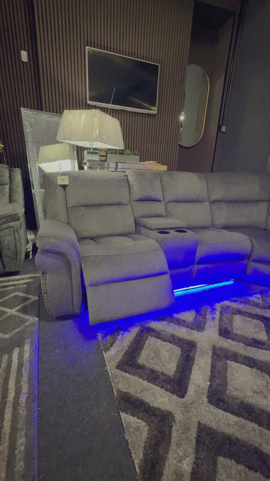 Berlin 5 Seater Fabric Electric Recliner Corner Sofa Inc Cupholder & Blue L.E.D Lightsh